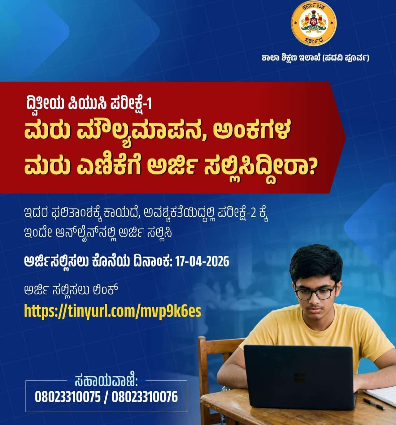 Revaluation ಫಲಿತಾಂಶಕ್ಕಾಗಿ ಕಾಯದೆ, ತಕ್ಷಣ Exam-2ಗೆ ಅರ್ಜಿ ಸಲ್ಲಿಸಲು ಸೂಚಿಸಲಾಗಿದೆ.